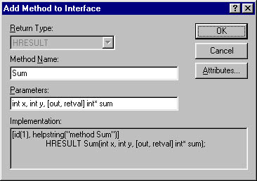 The next step after adding a COM+ object to an ATL project is to add the desired methods and properties to the interface. The simplest way to do this is to use the wizard-like dialog boxes provided by Visual C++. Figure 3-6 shows the Add Method To Interface dialog box.