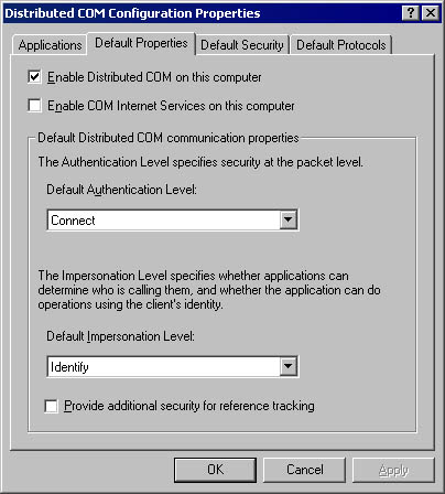 Launching the Distributed COM Configuration utility and clicking the Default Properties tab displays the options shown in Figure 18-2. The administrator can use these options to set the default authentication and impersonation options on a machinewide basis. The Enable Distributed COM On This Computer check box is the master switch of COM+. If this check box is deselected, all remote calls to and from the machine are rejected. When the system is first installed, this check box is selected. The Enable COM Internet Services On This Computer check box determines whether COM+ Internet Services (CIS) is available; by default, it's disabled. Select this check box if you're planning to use COM+ over the Internet, and then see the section titled "Internet Services" in Chapter 19.