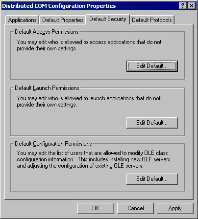 Figure 18-3. The Distributed COM Configuration utility's Default Security tab.