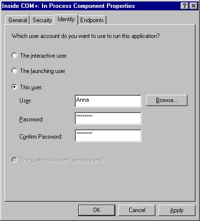 The third identity option is to configure the component for execution under a specific user account. When an attempt is made to launch the component, COM+ automatically initiates a system logon using the specified user account by calling the Win32 API function LogonUser, followed by a call to the CreateProcessAsUser function. As part of the logon procedure, a new, noninteractive window station is created for use by the component. This setting is often the best option for components that will serve many client programs simultaneously because all instances of the component will be loaded into one window station. In addition, if the class was registered with the REGCLS_MULTIPLEUSE flag, multiple clients will be able to share access to a single instance of the component.